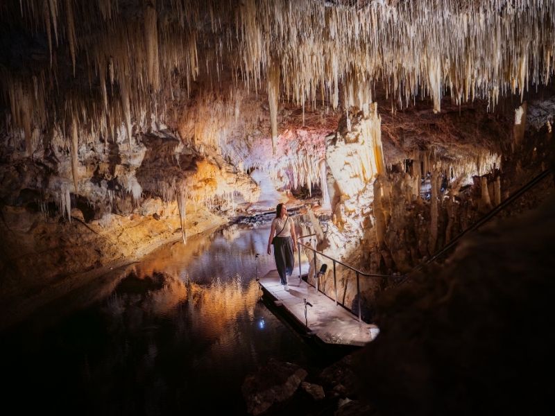 • Lake Cave Tucked beneath the Boranup karri forest along Caves Road, Lake Cave is widely regarded as the most visually spectacular of all the Margaret River caves. Descend through an ancient sinkhole into a crystal chamber where a permanent underground lake perfectly mirrors the delicate stalactite formations above. Including the remarkable Suspended Table: a multi-tonne crystal structure hovering impossibly over the water. The guided one-hour tour uses carefully placed lighting to reveal every detail of the chamber, ultimately creating shots that look like they belong in a nature documentary.