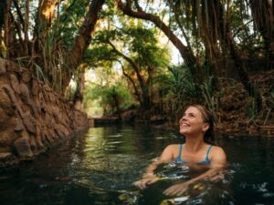 • Katherine Hot Springs Fed by thermal springs on the banks of the Katherine River and framed by lush tropical vegetation. The Katherine Hot Springs are as photogenic as they are relaxing. The clear, warm water, vivid green surroundings, and the was soft light filters through the tree canopy above combine to create content that looks like it belong in a travel magazine. Then, of course, you actually get to swim in it, which makes the whole experience even better. Tip: Early morning is magical. The mist rising off the warm water in the cool air creates an almost dreamlike atmosphere.